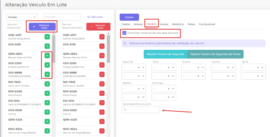 Selecione o(s) veículo(s) que deseja atribuir o controle de horário, vá na aba Horário, marque a caixa controlar horários de uso dos veículos e defina a faixa de horário permitida para o veículo funcionar, informe a velocidade mínima para o sistemar considerar deslocamento indevido.